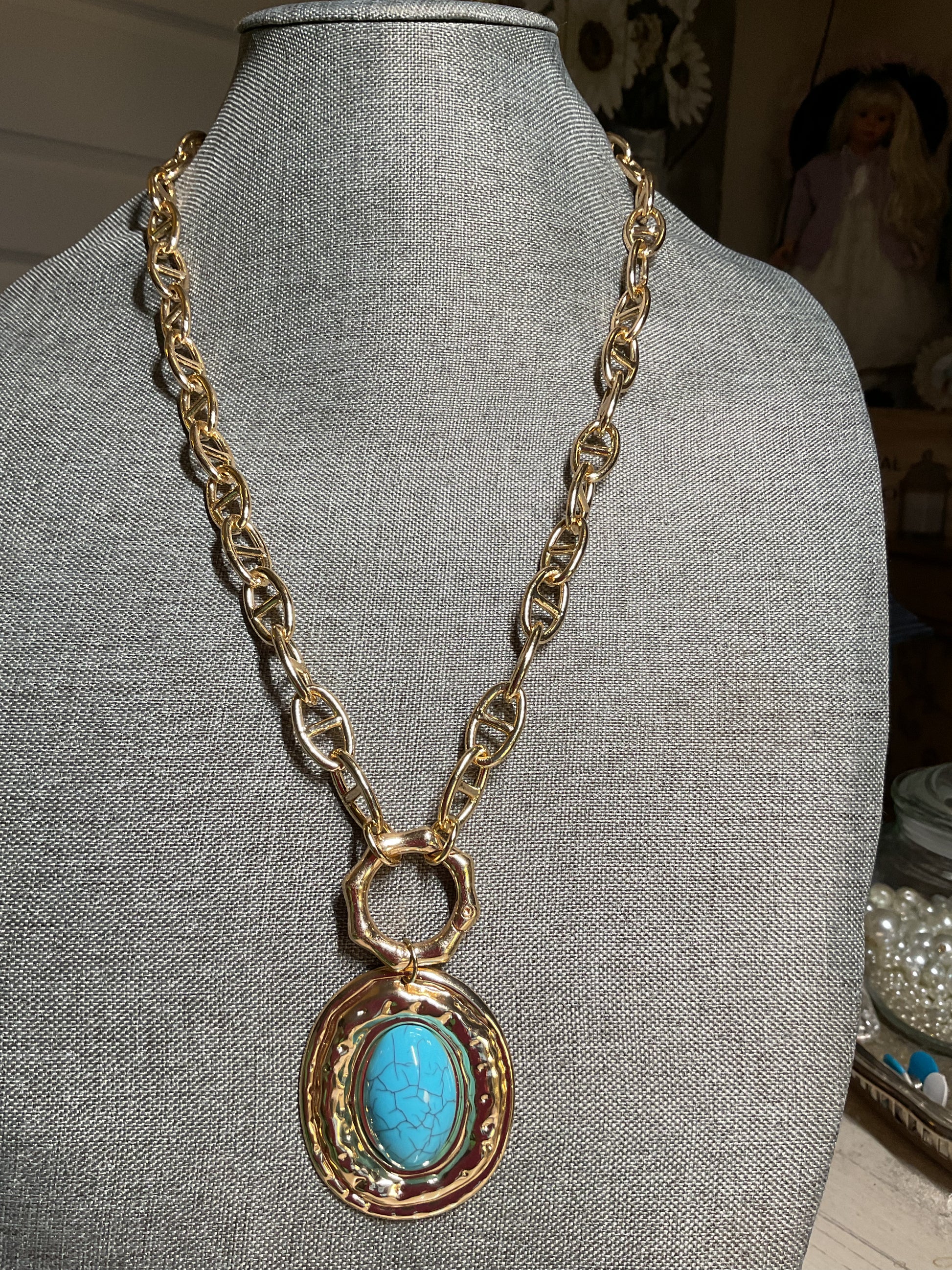 A long, chunky gold tone chain with a large turquoise and gold pendant