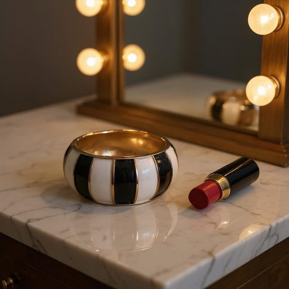 This black and white enamel bangle bracelet combines classic contrast with durable craftsmanship. The smooth enamel finish offers a polished look that resists wear, while the rigid bangle design ensures a comfortable and secure fit. Ideal for elevating both casual and formal ensembles, this bracelet brings a timeless, versatile accessory to your collection with understated sophistication.