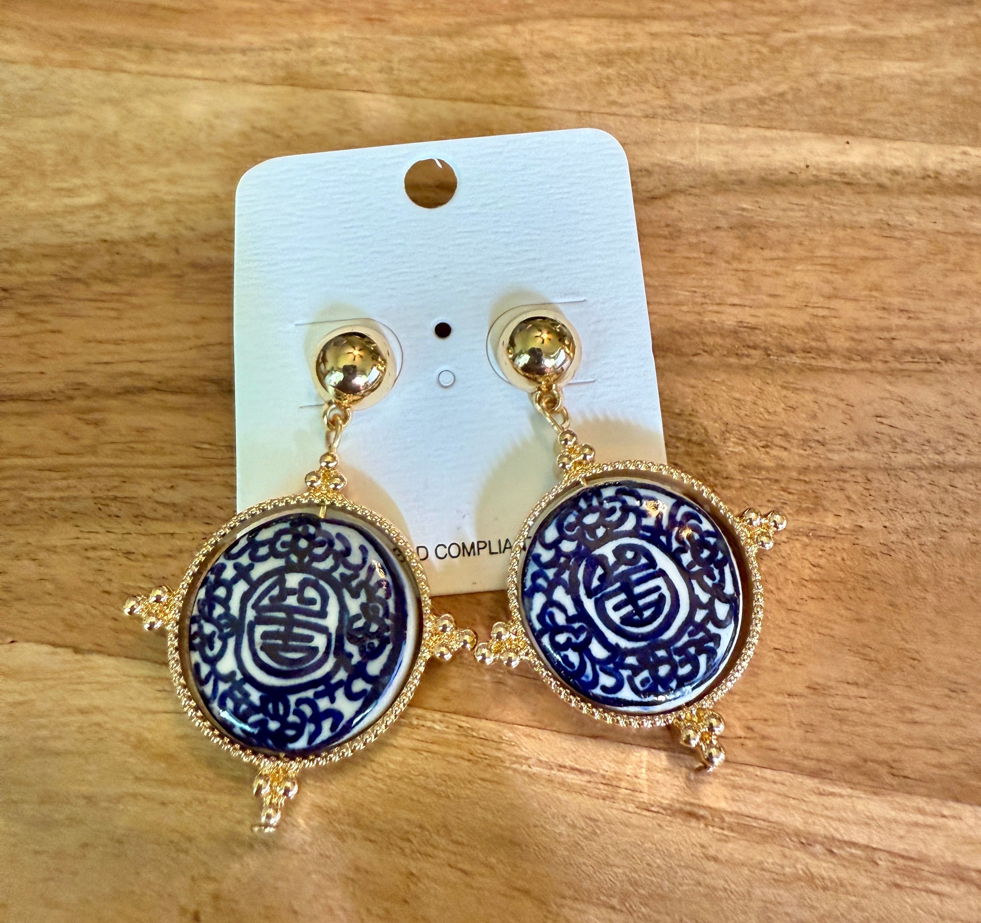 These blue, white, and gold dangle earrings combine classic elegance with contemporary design. Crafted to showcase a harmonious blend of colors, they provide a sophisticated accent that complements a variety of styles. The lightweight construction ensures comfortable wear, while the dangle design adds movement and visual interest, making them ideal for both professional settings and special occasions.