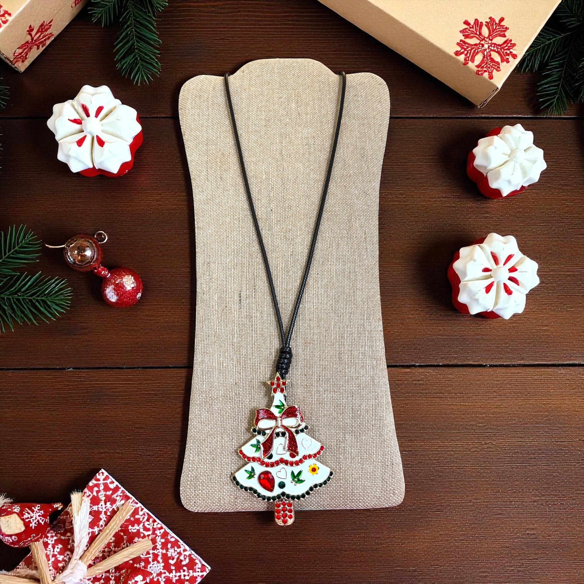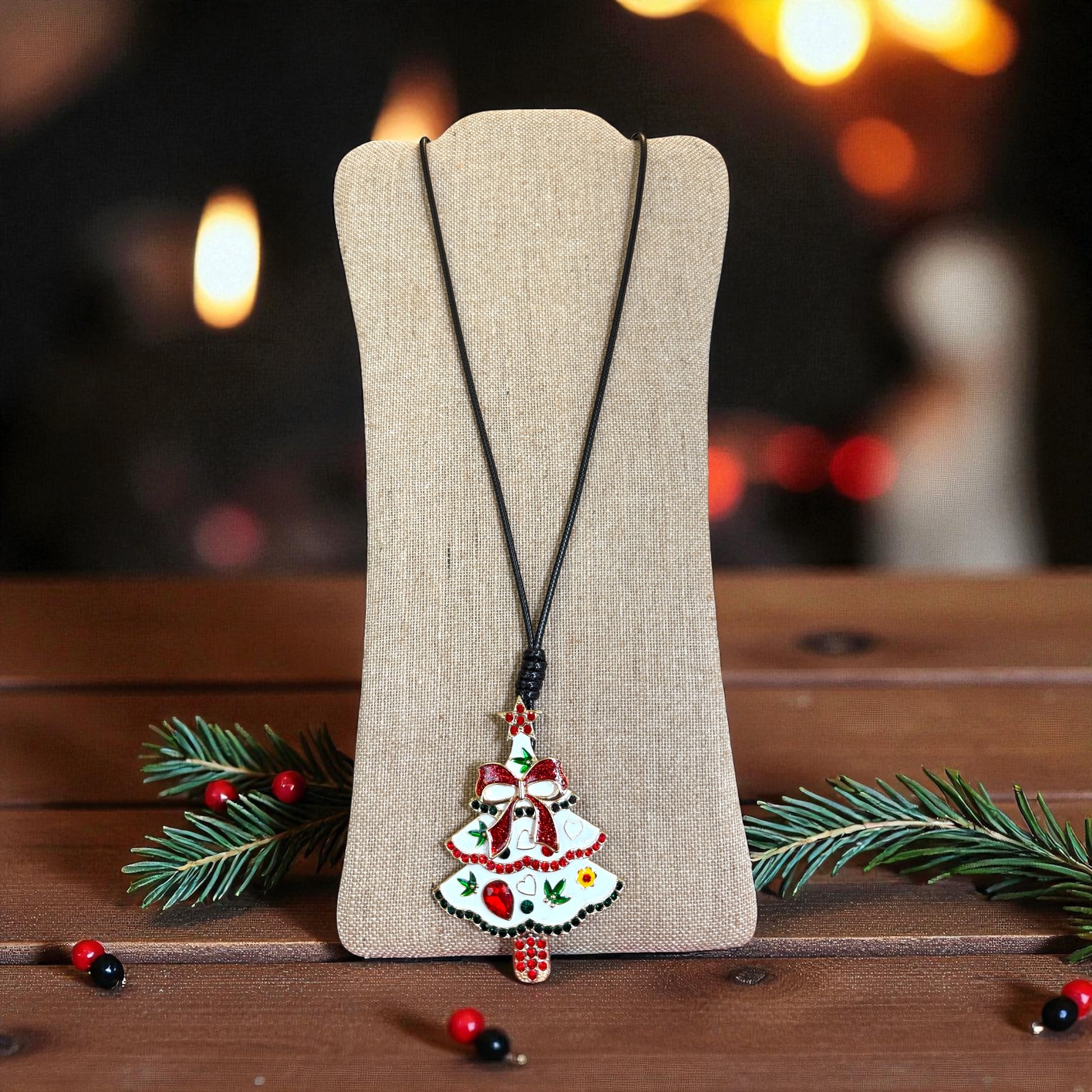 Elevate your holiday wardrobe with this sophisticated Christmas tree pendant necklace. Featuring a detailed tree-shaped pendant suspended from a sleek black cord, this piece strikes the perfect balance between festive charm and understated elegance. The adjustable cord design ensures a comfortable fit for any occasion, whether you're attending a formal gathering or keeping things casual. An ideal accessory for the season, it pairs effortlessly with both traditional and contemporary styles. Perfect as a gift for someone special or as a personal indulgence during the holidays.