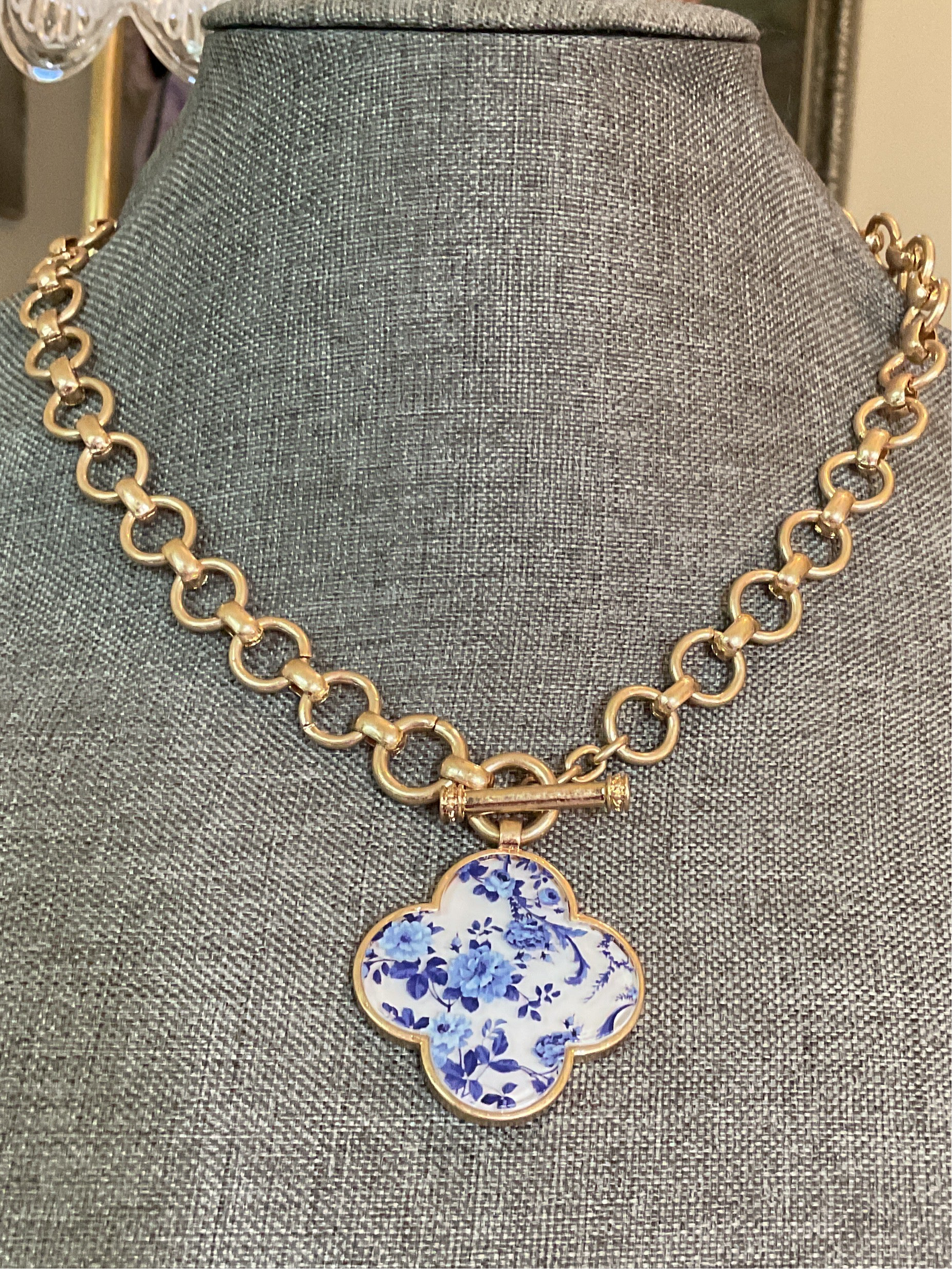 This elegant gold chain features a delicate pendant shaped like a clover, highlighted by striking blue and white accents. The refined combination of colors enhances its timeless design, making it a versatile accessory suitable for both everyday wear and special occasions. Crafted with attention to detail, this piece offers a subtle yet sophisticated touch to any outfit.