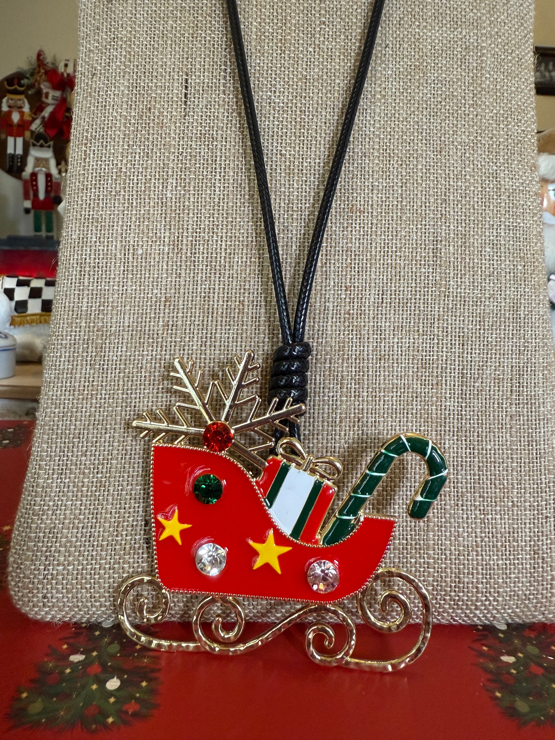 This striking sleigh pendant necklace combines festive charm with sophisticated design. The substantial pendant features intricate detailing that captures the spirit of holiday tradition, suspended from a sleek black cord that provides modern contrast. The black cord offers versatility, pairing effortlessly with both casual and dressy ensembles throughout the season. An ideal choice for those seeking a statement piece that balances nostalgic appeal with contemporary style, this necklace delivers timeless elegance with seasonal flair.