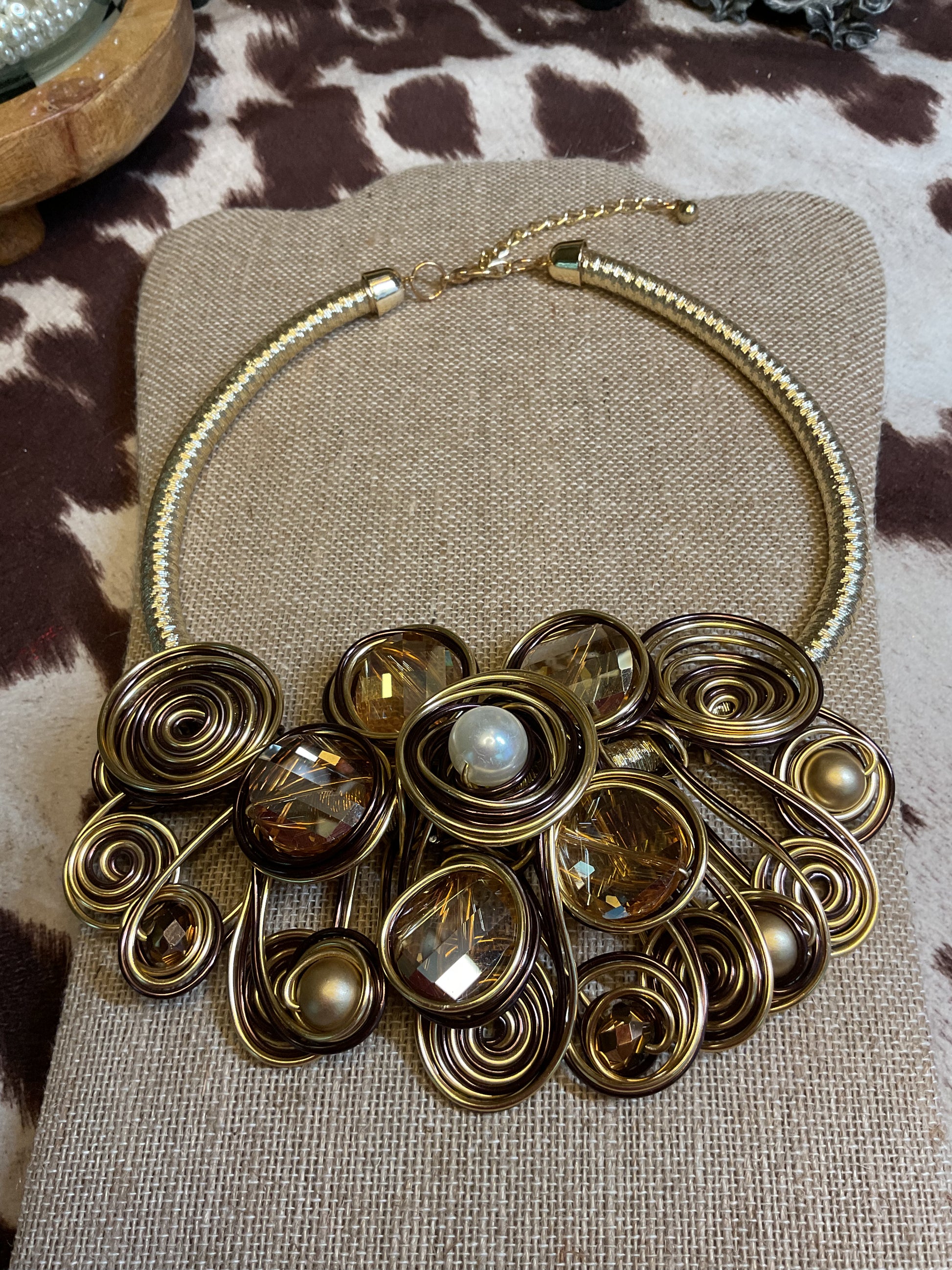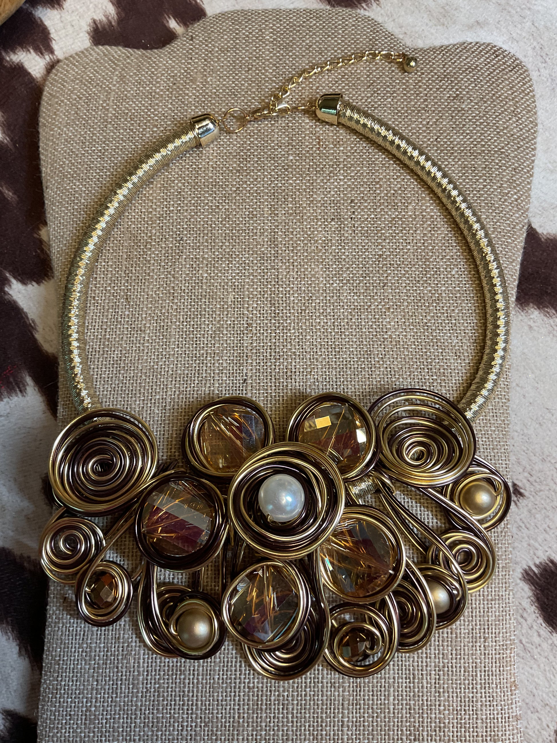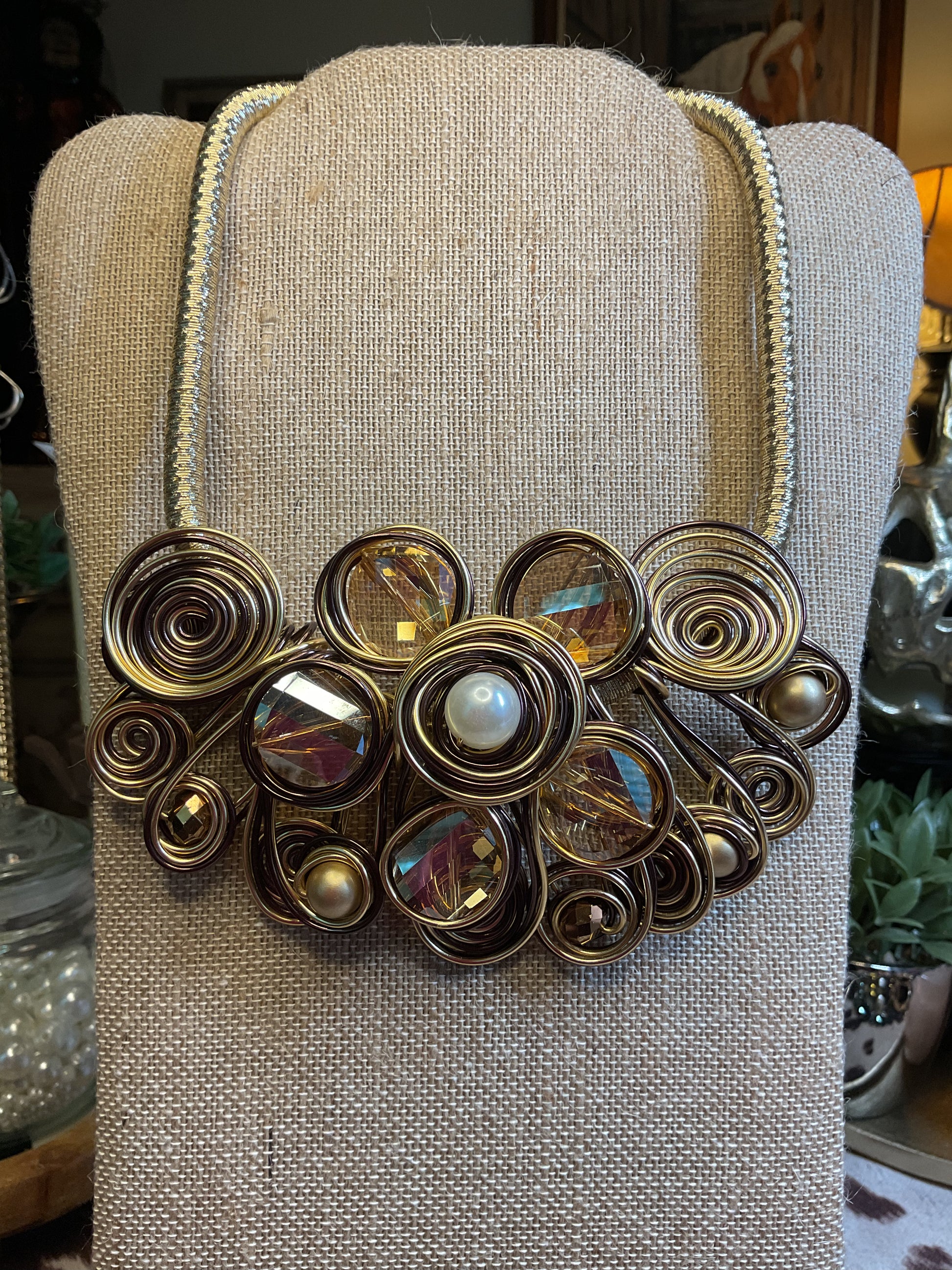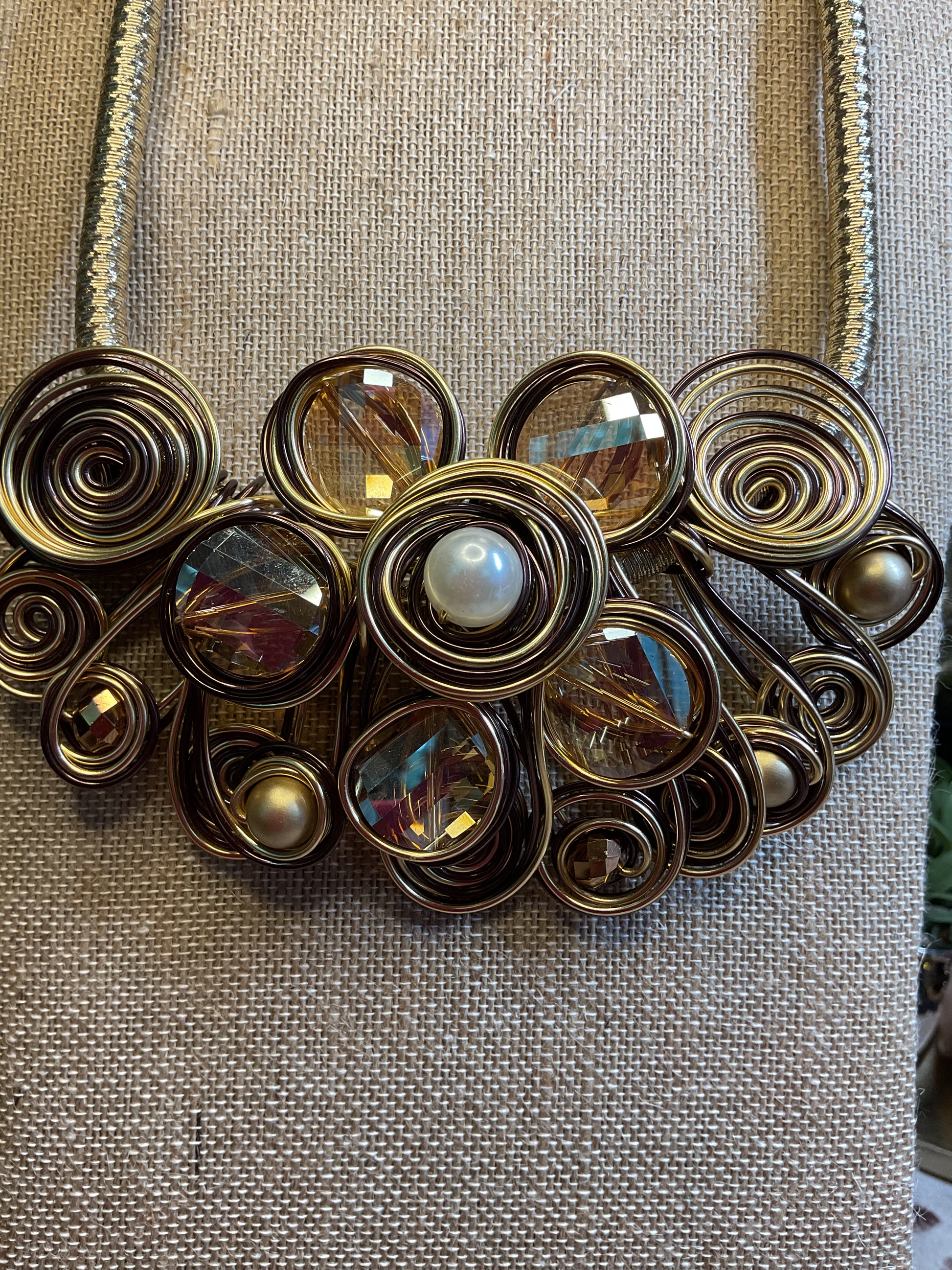 Large statement necklace with champagne color stones and pearls wrapped in gold wire