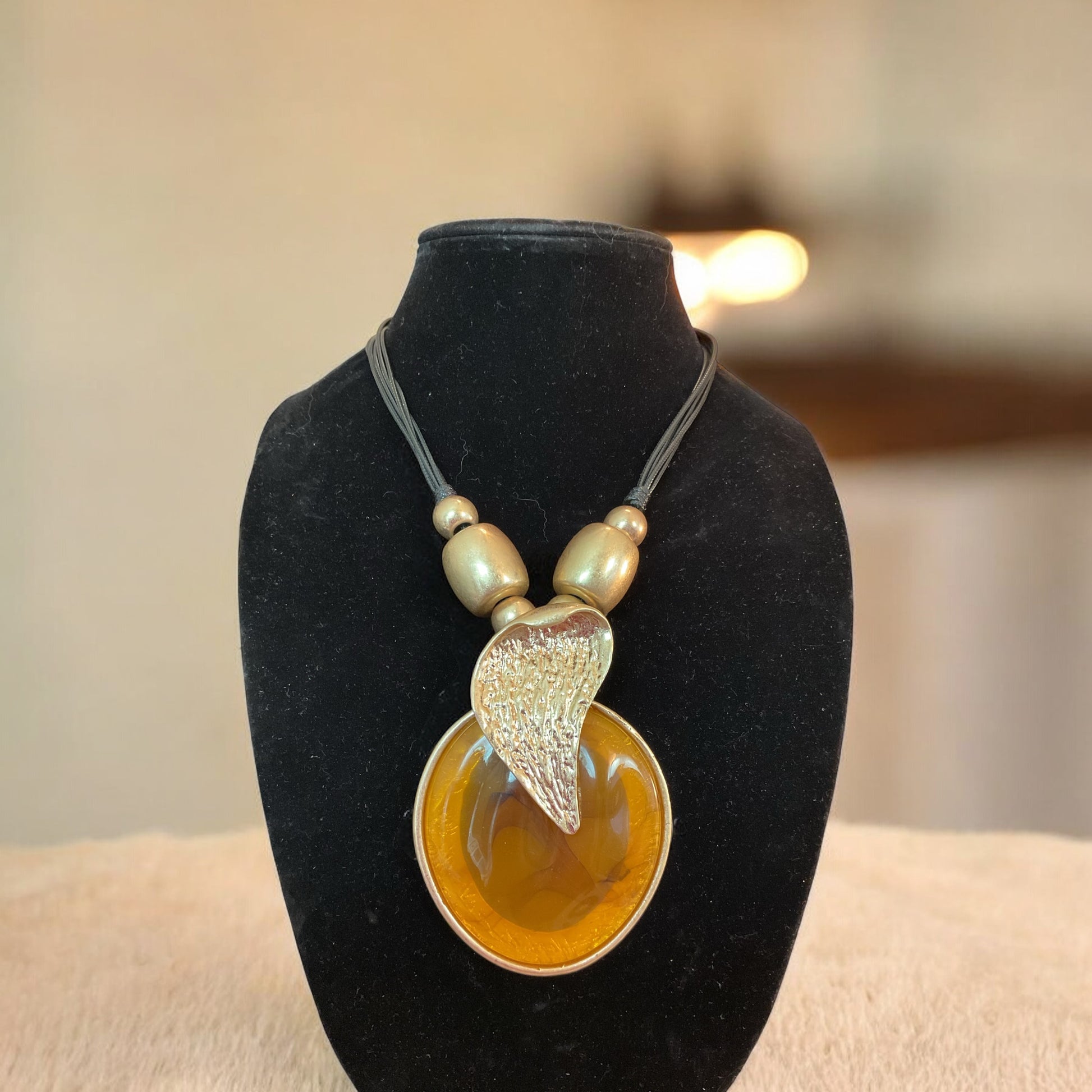 This short statement necklace features a prominent large stone as its focal point, enhanced by elegant gold leaf accents. Expertly designed to balance boldness with sophistication, it offers a versatile accessory that can elevate a variety of outfits. Crafted with attention to detail, this piece adds a refined touch of luxury and visual interest without overwhelming the wearer. This is a brand new piece of fashion jewelry.