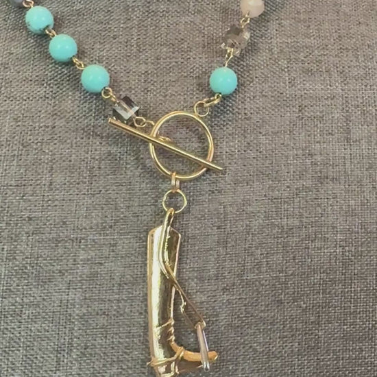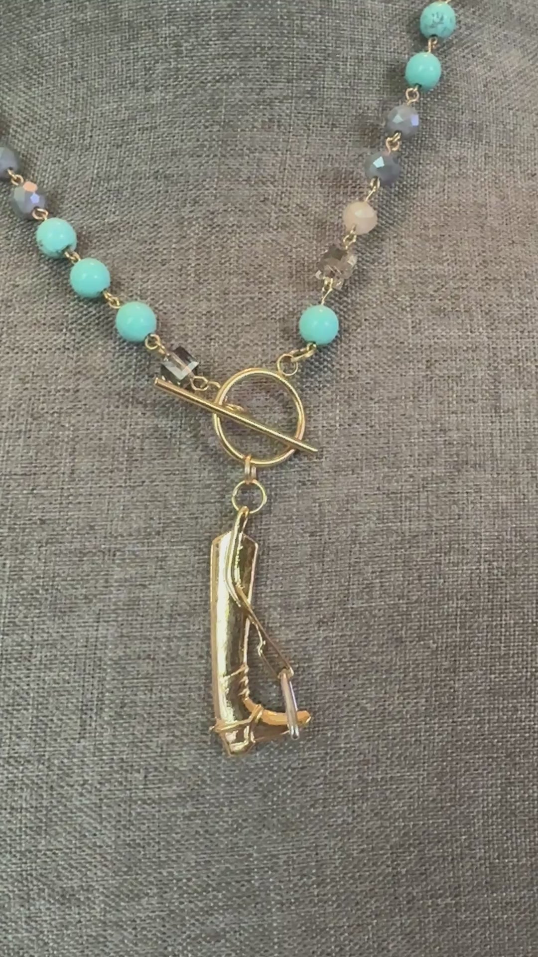 This expertly designed necklace features turquoise rosary beads paired with a distinctive English boot pendant. The vibrant turquoise beads offer natural beauty, while the English boot adds a unique equine touch. Crafted with attention to detail, this piece serves as a meaningful accessory that blends tradition with contemporary style.